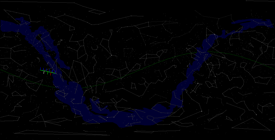 Путь астероида показан зеленой дугой. Голубыми черточками с правой стороны (так можно определить направление движения астероида!) от зеленного трека показаны моменты полуночи по UT. На левой стороне трека астероида показаны красной галочкой момент минимального сближения, белой отмечан момент достижения максимальной яркости, а зеленной отмечен момент достижения максимальной угловой скорости.