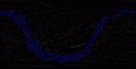 Путь астероида показан зеленой дугой. Голубыми черточками с правой стороны (так можно определить направление движения астероида!) от зеленного трека показаны моменты полуночи по UT. На левой стороне трека астероида показаны красной галочкой момент минимального сближения, белой отмечан момент достижения максимальной яркости, а зеленной отмечен момент достижения максимальной угловой скорости.