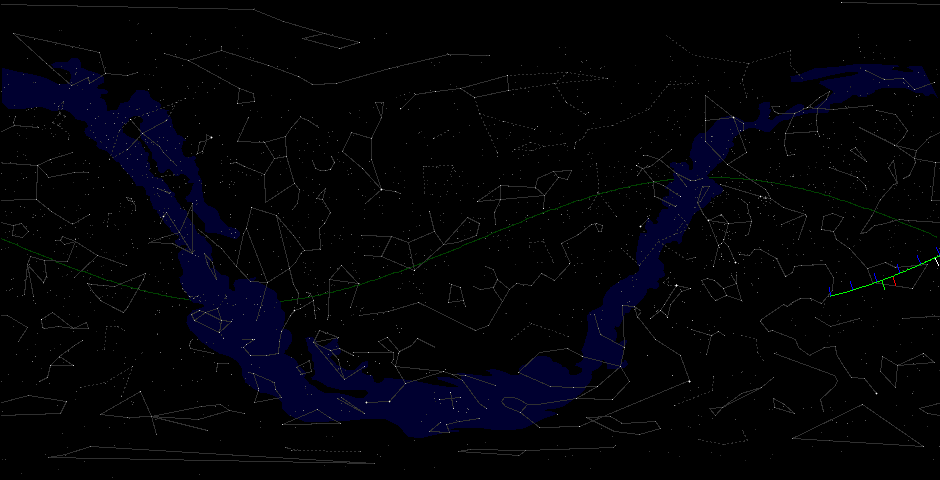 Путь астероида показан зеленой дугой. Голубыми черточками с правой стороны (так можно определить направление движения астероида!) от зеленного трека показаны моменты полуночи по UT. На левой стороне трека астероида показаны красной галочкой момент минимального сближения, белой отмечан момент достижения максимальной яркости, а зеленной отмечен момент достижения максимальной угловой скорости.